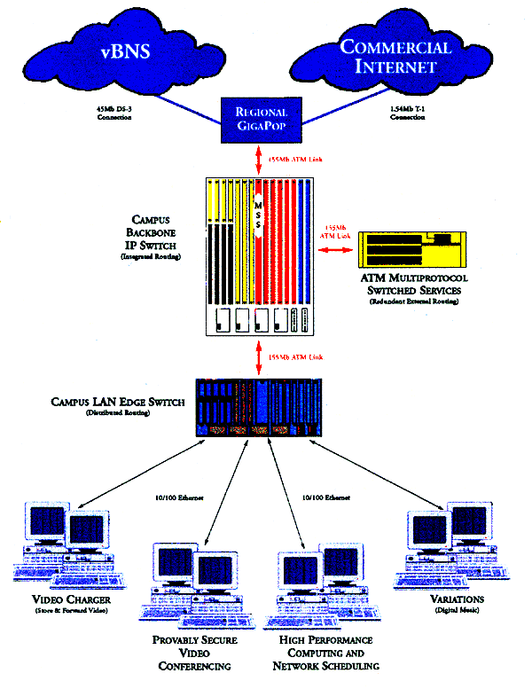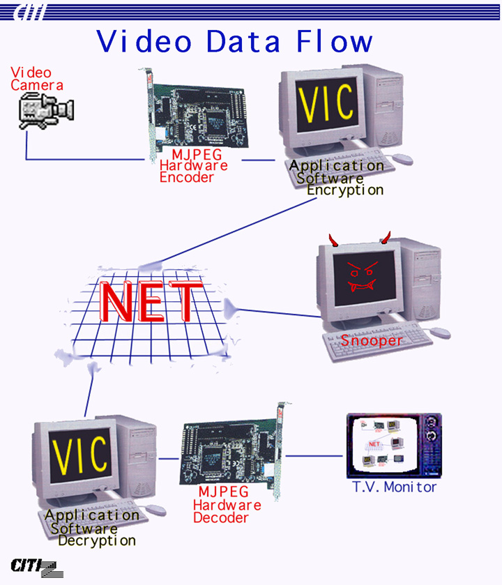 We demonstrated the Secure Videoconferencing Project work at the Internet2 Member Meeting held in Washington D.C.,October 7-9, 1997 at Highway_1. We were one of 15 demonstrations chosen to show the usefulness and need for Internet2 technologies. MCI, Cisco, FORE, and IBM all dedicated hardware and expertise to instantiate an Internet2 network based on the vBNS. A network consisting of a regional gigapop and three campuses we modeled at the demonstration site. For this demonstration, we choose the IBM 42T RS6000 platform with its integrated Ultimedia Services MJPEG hardware encoding and decoding capabilities as both the transmit and receive machines. We did not include the smartcard key exchange, choosing instead to hard coded a pair of keys. We did include a video "snooper". The snooper is a third-party that intercepts and displays video packets from an unencrypted VIC session. Once the encryption is enabled, the snooper is defeated. We also pulled the video data directly off the receiver machines MJPEG card into a monitor as is shown in this video data flow diagram. We used the Secure Videoconferencing Demo to deliver the video data portion of John Mansfields Teaching Scanning Electron Microscope demonstration. Pictures from Highway1Other Stuff